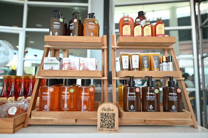 นอกเหนือจากการพัฒนาเป็นส่วนประกอบในอาหารแล้ว น้ำมันปาล์มแดงยังต่อยอดเป็นส่วนประกอบกลุ่มเวชสำอาง เครื่องประทินผิว ซึ่งจากผลการวิจัยฯในปี 2563 ได้ยกระดับการผลิตโรงบีบปาล์ม ชุมชนจากเกรดอาหารสัตว์เป็นเกรดเวชสำอาง และในปี 2566 ที่ผ่านมาผลิตน้ำมันปาล์มแดงธรรมชาติและต่อยอดสร้างมูลค่าเพิ่มเป็นผลิตภัณฑ์หลากหลาย โดยมีโรงงานต้นแบบอยู่ที่วิสาหกิจชุมชน แปลงใหญ่ปาล์มน้ำมัน ท่าสะบ้า จ.ตรัง