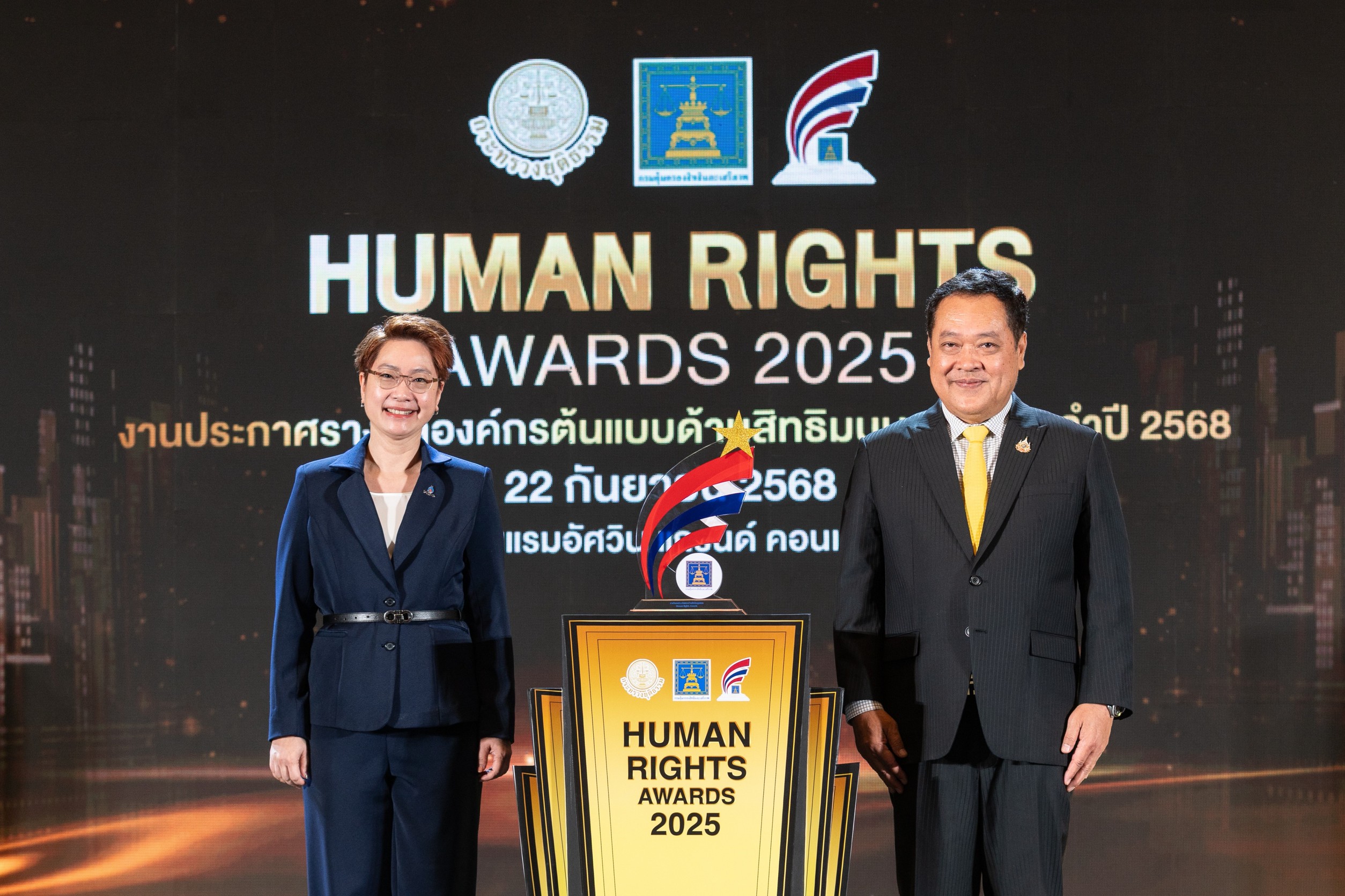 บริษัท ปตท.สำรวจและผลิตปิโตรเลียม จำกัด (มหาชน) หรือ ปตท.สผ. โดยนางสุศมา ปิตากุลดิลก (ซ้าย) ผู้ช่วยกรรมการผู้จัดการใหญ่ สายงานความยั่งยืนและบริหารผู้มีส่วนได้ส่วนเสีย รับมอบรางวัลองค์กรต้นแบบด้านสิทธิมนุษยชน ประเภทรางวัลดีเด่น ระดับ Gold สำหรับองค์กรรัฐวิสาหกิจ ประจำปี 2568 จากพันตำรวจเอก ทวี สอดส่อง (ขวา) รัฐมนตรีว่าการกระทรวงยุติธรรม ต่อเนื่องเป็นปีที่ 2 โดยรางวัลระดับ Gold ถือเป็นรางวัลสูงสุด ซึ่งมอบให้แก่องค์กรที่ได้รับรางวัลดีเด่นติดต่อกัน 5 ปีขึ้นไป พิธีมอบรางวัลจัดขึ้นโดยกรมคุ้มครองสิทธิและเสรีภาพ กระทรวงยุติธรรม ณ โรงแรมอัศวิน แกรนด์ คอนเวนชั่น กรุงเทพฯ