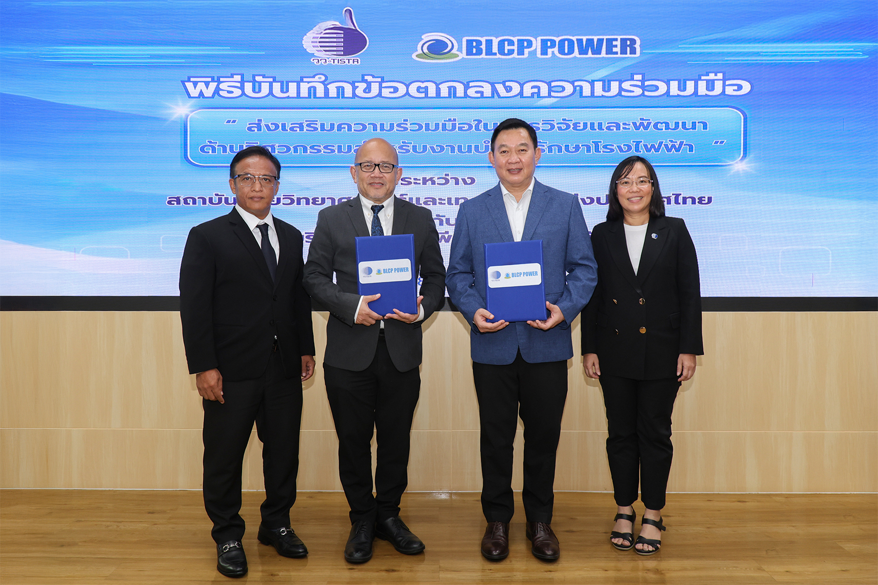 นายยุทธนา เจิรญวงศ์ (ที่สองจากซ้าย) กรรมการผู้จัดการใหญ่ บริษัท บีแอลซีพี เพาเวอร์ จำกัด (BLCP Power Limited) หรือ โรงไฟฟ้าบีแอลซีพี และ ผู้ช่วยศาสตราจารย์ ดร.วีรชัย อาจหาญ (ที่สองจากขวา) ผู้ว่าการสถาบันวิจัยวิทยาศาสตร์และเทคโนโลยีแห่งประเทศไทย (วว.) ร่วมลงนามความร่วมมือในการวิจัยและพัฒนาด้านวิศวกรรมสำหรับงานบำรุงรักษาโรงไฟฟ้า เพื่อพัฒนาเทคโนโลยีและปรับปรุงกิจกรรมการดำเนินงานของโรงไฟฟ้า โดยมีเป้าหมายในการยกระดับความพร้อมการใช้งานและความน่าเชื่อถือของโรงไฟฟ้าในระยะยาว สำหรับการลงนามครั้งนี้มี นายอดุลย์ อุดมวรวุฒิ (คนแรกซ้าย) รองผู้จัดการใหญ่ บริษัท บีแอลซีพี เพาเวอร์ จำกัด (BLCP Power Limited) และ ดร.โศรดา วัลภา (คนแรกขวา) รองผู้ว่าการบริการอุตสาหกรรม ร่วมเป็นสักขีพยาน เมื่อเร็ว ๆ นี้