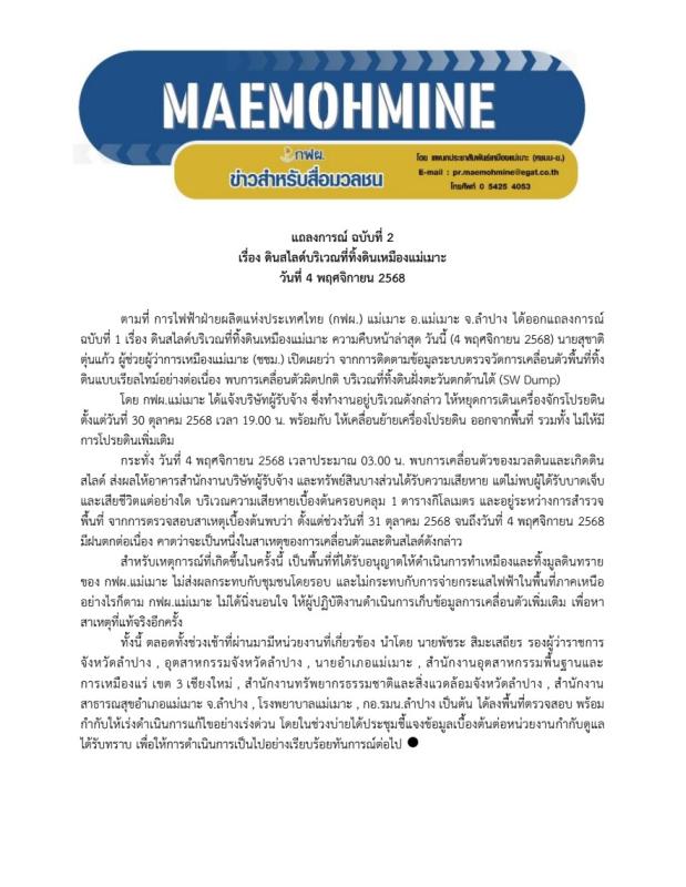 ตามที่ การไฟฟ้าฝ่ายผลิตแห่งประเทศไทย (กฟผ.) แม่เมาะ อ.แม่เมาะ จ.ลำปาง ได้ออกแถลงการณ์ ฉบับที่ 1 เรื่อง ดินสไลด์บริเวณที่ทิ้งดินเหมืองแม่เมาะ ความคืบหน้าล่าสุด วันนี้ (4 พฤศจิกายน 2568) นายสุชาติ ตุ่นแก้ว ผู้ช่วยผู้ว่าการเหมืองแม่เมาะ (ชชม.) เปิดเผยว่า จากการติดตามข้อมูลระบบตรวจวัดการเคลื่อนตัวพื้นที่ทิ้งดินแบบเรียลไทม์อย่างต่อเนื่อง พบการเคลื่อนตัวผิดปกติ บริเวณที่ทิ้งดินฝั่งตะวันตกด้านใต้ (SW Dump)